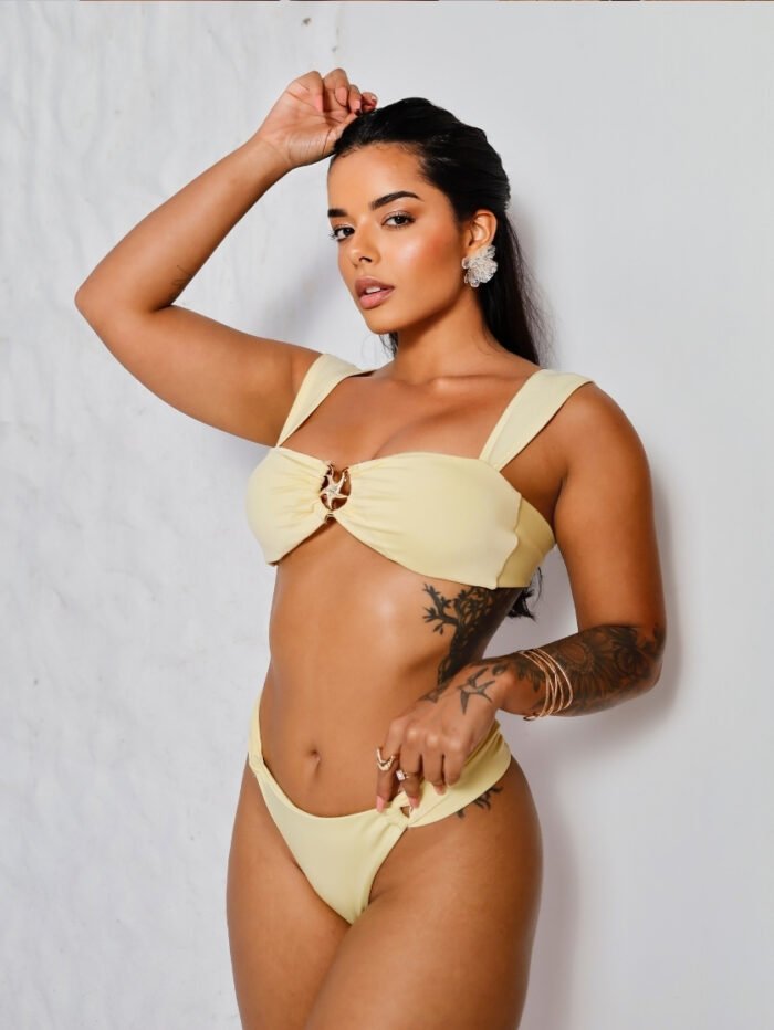 Prepare-se para irradiar charme com o Biquíni Lucy Estrela, um modelo que une sensualidade e delicadeza na medida certa. Seu grande destaque é o pingente em formato de estrela no centro do top, que traz um toque romântico e moderno, chamando atenção com elegância nos mínimos detalhes.