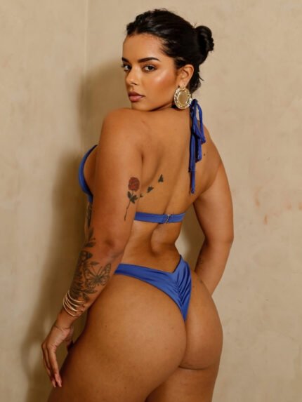 Seu top tomara que caia com fivela central traz um toque moderno e sofisticado, valorizando o colo com elegância e atitude. A calcinha empina bumbum com modelagem fio dental destaca as curvas de forma sutil e sensual, garantindo aquele visual irresistível que toda fashionista ama.