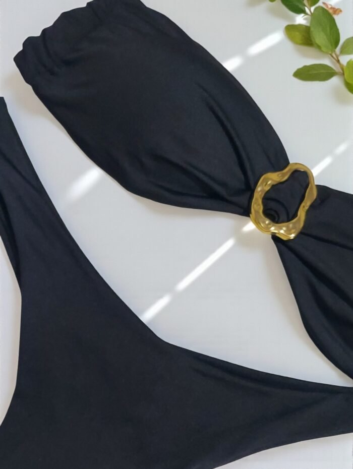 Seu top tomara que caia com fivela central traz um toque moderno e sofisticado, valorizando o colo com elegância e atitude. A calcinha empina bumbum com modelagem fio dental destaca as curvas de forma sutil e sensual, garantindo aquele visual irresistível que toda fashionista ama.
