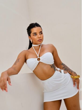 Para completar o visual, a charmosa saia curta funciona como saída de praia, com caimento leve e toque fashionista, além do detalhe da argola dourada que a torna perfeita para te levar da areia ao beach club com facilidade.