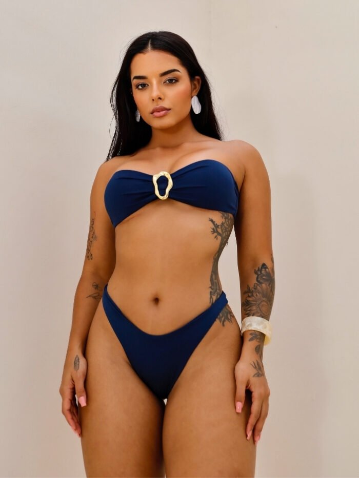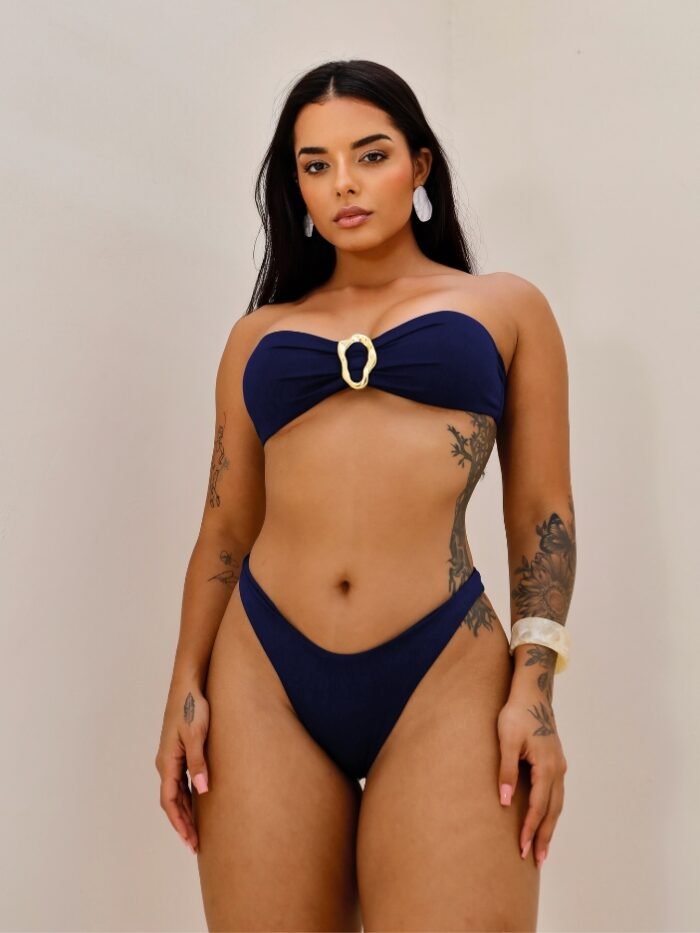 O top em modelagem oval é o destaque do conjunto, com delicados enfeites dourados em formato orgânico que trazem um toque de sofisticação e exclusividade. Conta com bojo removível, elástico embutido e amarração nas costas e na nuca, proporcionando ajuste confortável e seguro.
